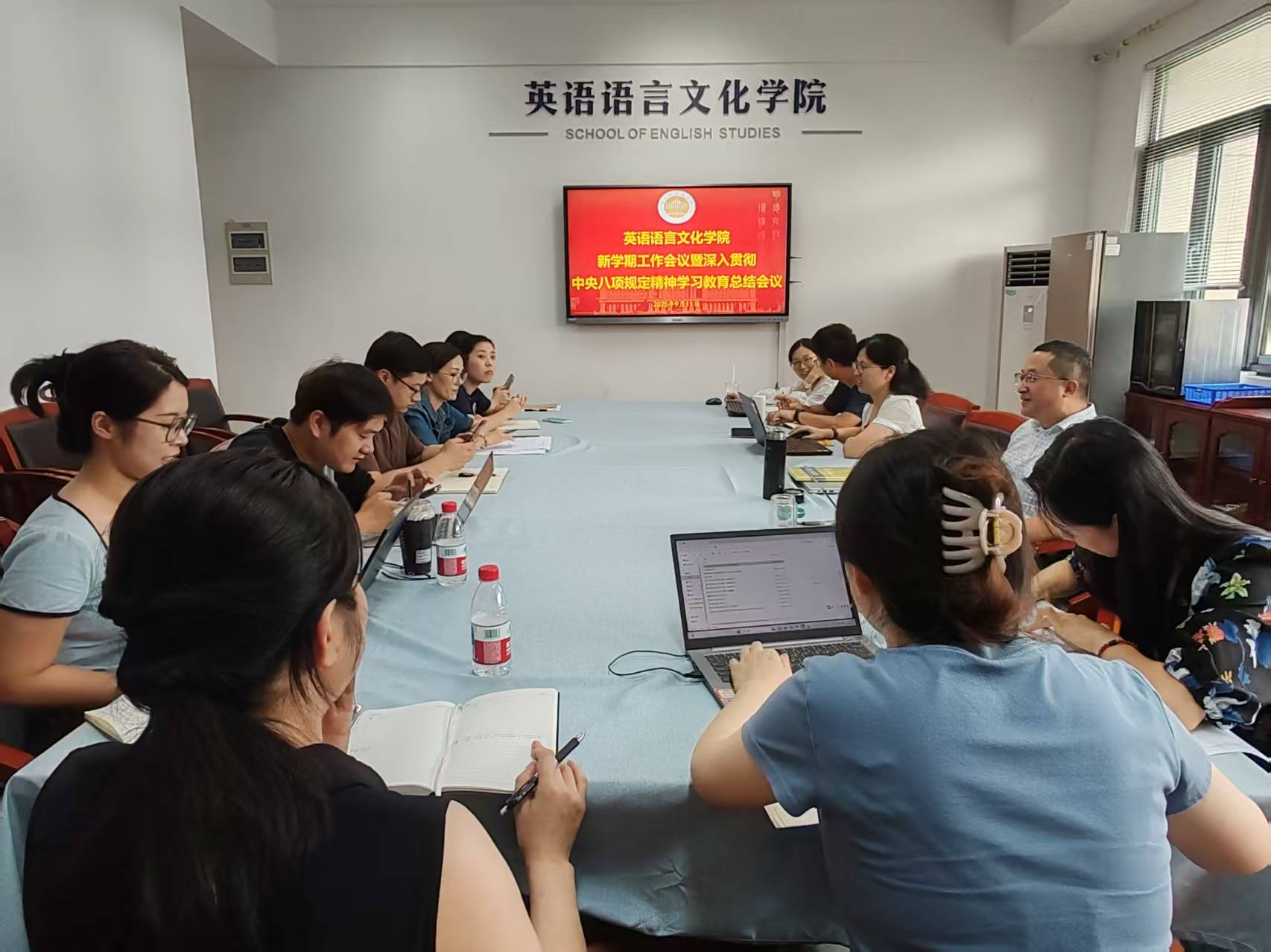 9月11日下午和晚上,英文学院线下和线上分步召开了新学期开学准备会。学院党政领导班子成员、各基层组织学科专业负责人、各系教学主管和科研主管、全体办公室工作人员和辅导员参加了会议。