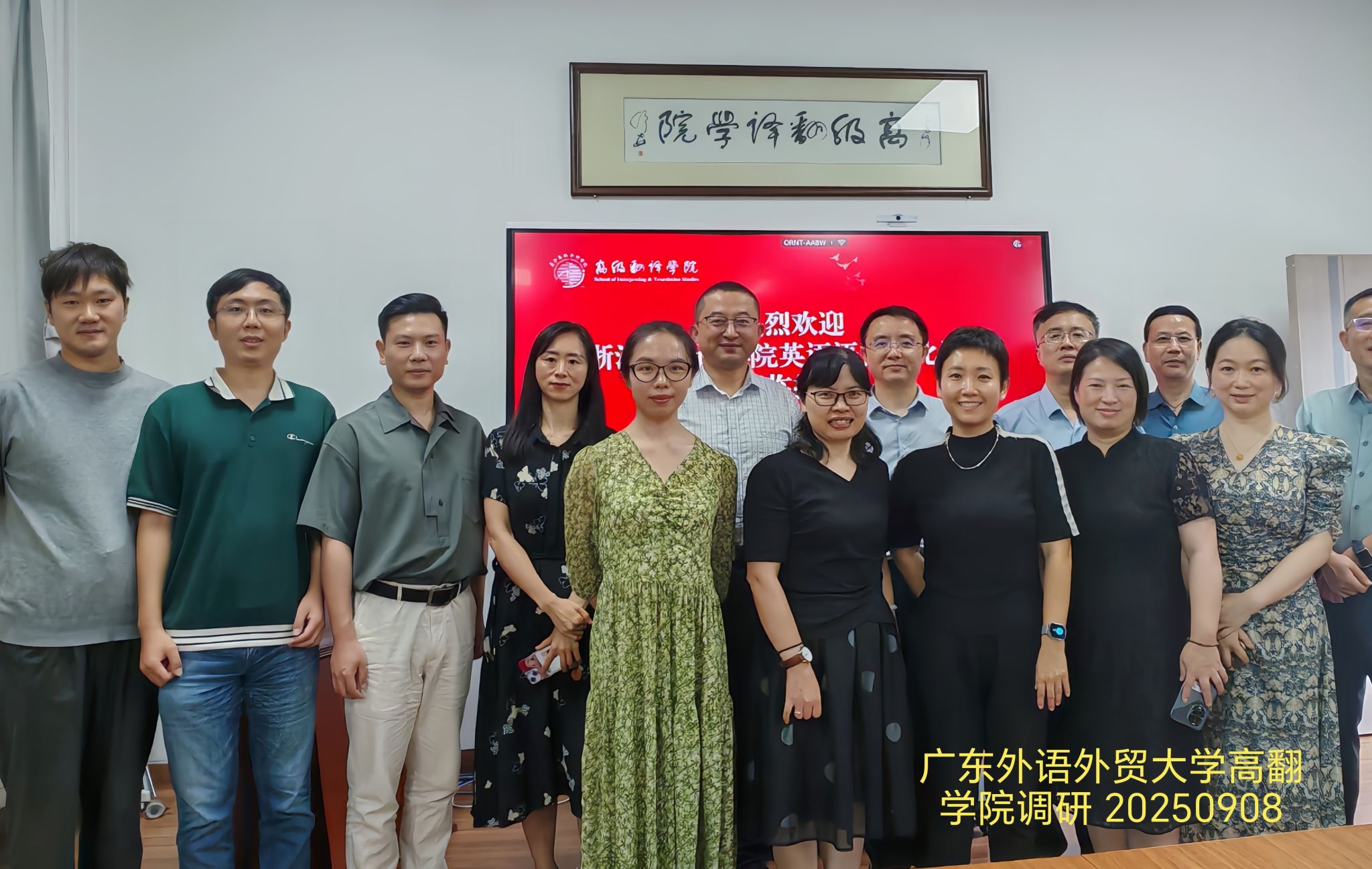 广东外语外贸大学高级翻译学院院长蓝红军、党委书记李和民、副院长王薇薇、副院长王丹、党委副书记李政鸿等对学院一行的到来表示热烈欢迎。他们着重介绍了高翻学院高规格的国家级教学团队、高质量的人才培养、应用型的科研成果以及高显示度的社会服务等情况,并就思政品牌建设、开展有组织的科研、建设高水平团队、加入翻译类联盟、资助国际交流项目、MTI人才培养、翻译类专业就业等解答了调研问题。
