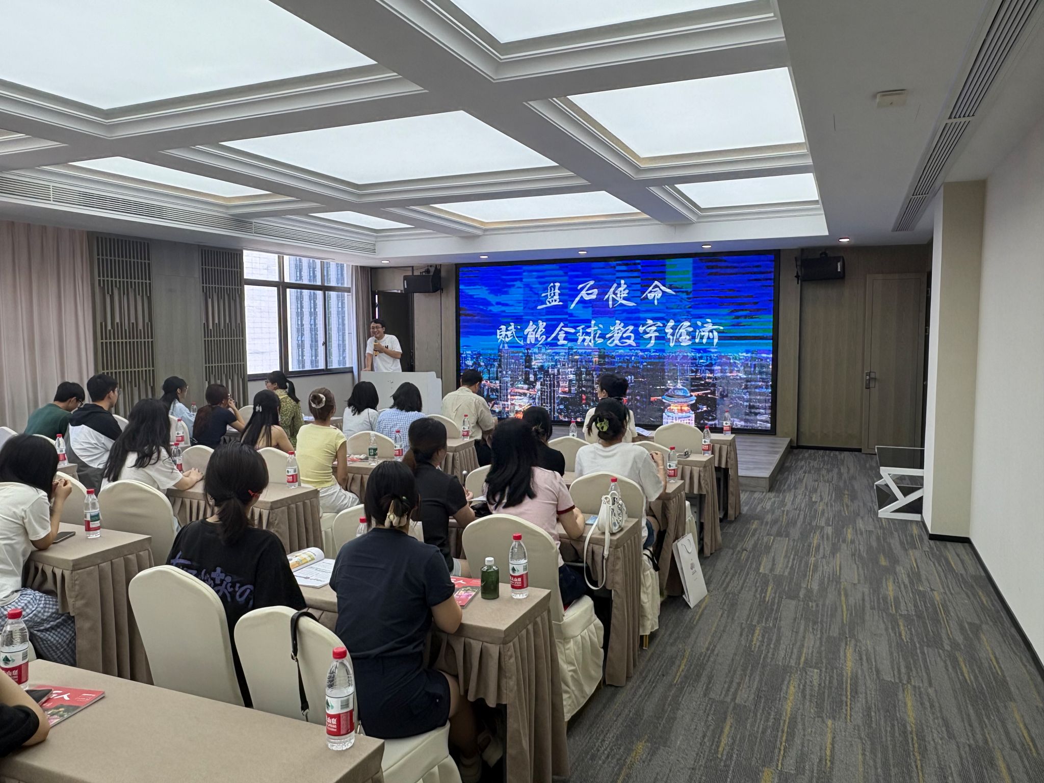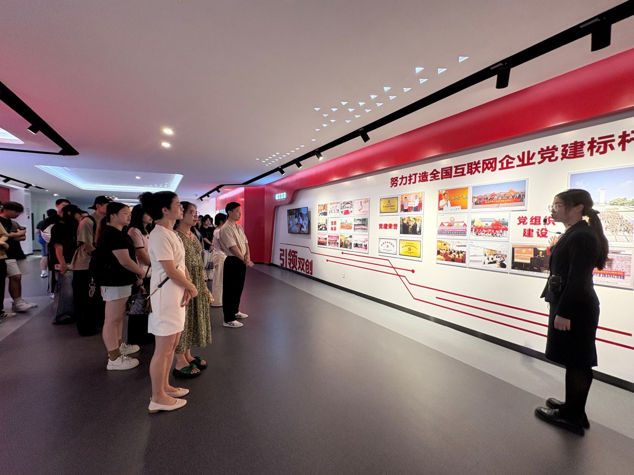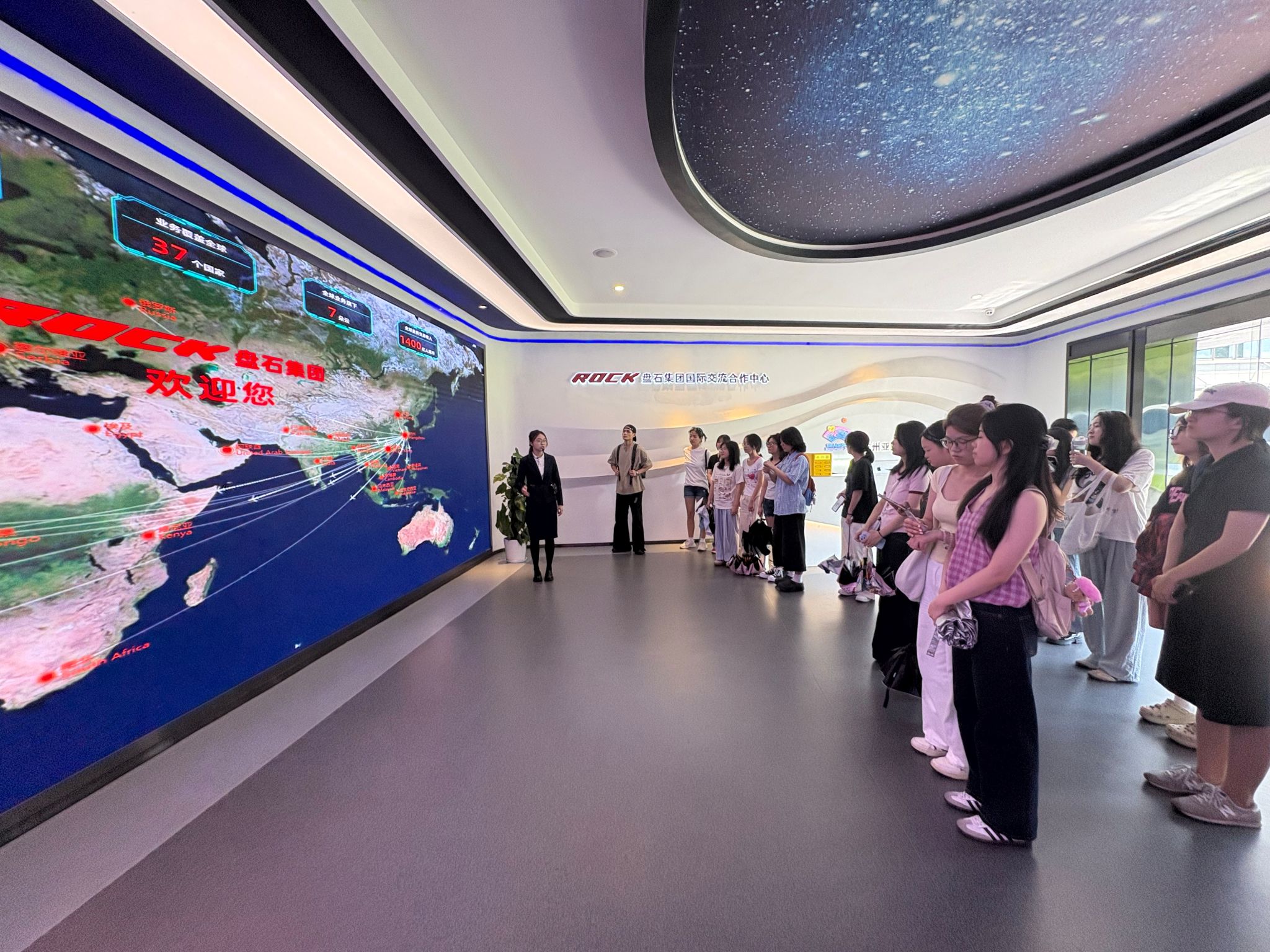 7月2日,22级商务英语系学生在英文学院党委副书记、纪委书记欧万彬、国别区域和商务系教学主管郭安琪以及专任教师陈晶莉的带领下走进杭州盘石集团,开启暑期数字经济研学之旅。在集团展厅,师生通过"硬核发展""文化烙印""荣誉勋章"三组关键词,系统了解企业从西湖畔创业团队到全球数字平台服务商的蜕变历程,感受"七朵云"核心业务矩阵的技术积淀与"敢为天下先"的浙商精神。特别在党建文化墙区域,盘石集团作为"全国互联网企业党建标杆"的实践经验,生动展现了红色基因与数字经济的深度融合,为企业发展注入独特精神内核。