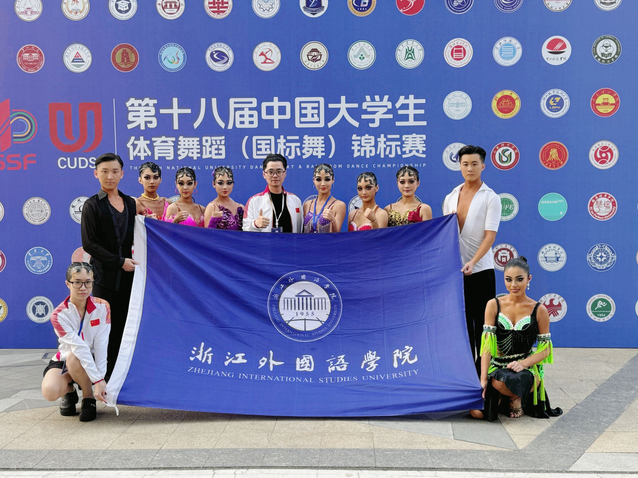 6月9日至12日,第十八届中国大学生体育舞蹈(国标舞)锦标赛在郑州落幕。本届赛事吸引全国176所高校1800余名选手参赛,规模创历届之最。浙江外国语学院体育舞蹈队10名运动员突出重围,获得全国甲组院校双人竞技拉丁两项银牌,双人四项铜牌,女子单人竞技三项第四名,女子六人组团体第五名,双人竞技三项第八名,浙江外国语学院获得体育道德风尚运动队称号。同时,余兴星、王艳、胡易苗、蓝茜四名队员获"体育道德风尚运动员"称号。