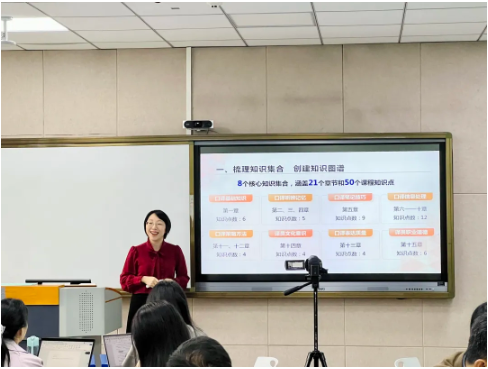 英语语言文化学院王晓露老师围绕“梳理知识集合,创建知识图谱”“认知特点导向,创建问题图谱”等内容,分享自己的知识图谱课程建设经历的同时,向老师们展示了数智时代建立知识图谱的重要性和必要性,并以课堂教学内容为例对建立知识图谱的过程进行梳理。目前该知识图谱在日常教学中已应用于《商务口译》等课程,取得了良好效果。