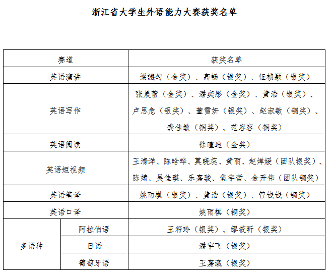 近日,由浙江省大学生科技竞赛委员会主办的第一届“外研社·国才杯”“理解当代中国” 浙江省大学生外语能力大赛各赛道比赛圆满落下帷幕。我校学子连创佳绩,在英语演讲、英语写作、英语阅读、英语短视频、英语笔译、英语口译、多语种7个系列赛事均有获奖,包括金奖4项、银奖12项,铜奖6项,共计22项,其中8位选手获得参加全国总决赛的资格。