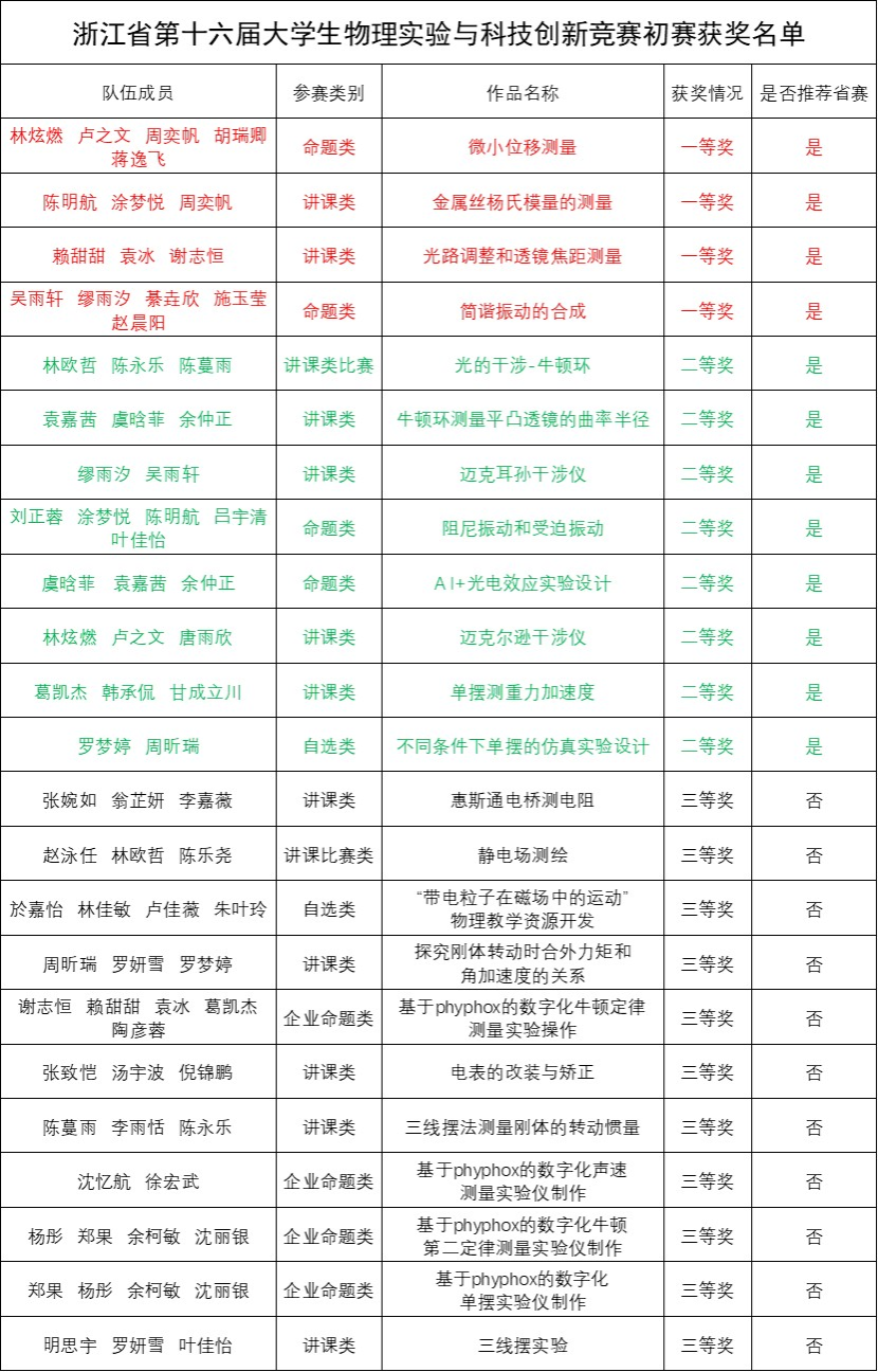 第十六届大学生物理实验与科技创新竞赛是省级A类竞赛,浙江外国语学院校级初赛由教务处主办,教育学院科教系承办。本届大赛于2025年4月中旬正式启动,参赛学生分别来自教育学院科学教育专业、数学与应用数学专业和小学教育专业等,共计约60名学生报名参赛。初赛于2025年5月15日举行,经3位评审专家评议,现将获奖名单予以公布(同一等级排名不分先后)。